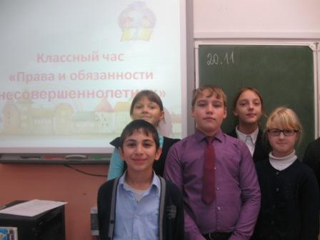 20 ноября в День правовой помощи детям в 5 б классе прошёл классный час "Права и обязанности несовершеннолетних". В ходе мероприятия учащиеся оказывали консультативную помощь литературным героям, решали ситуационные задачи. Провела классный час Зараева И.А.