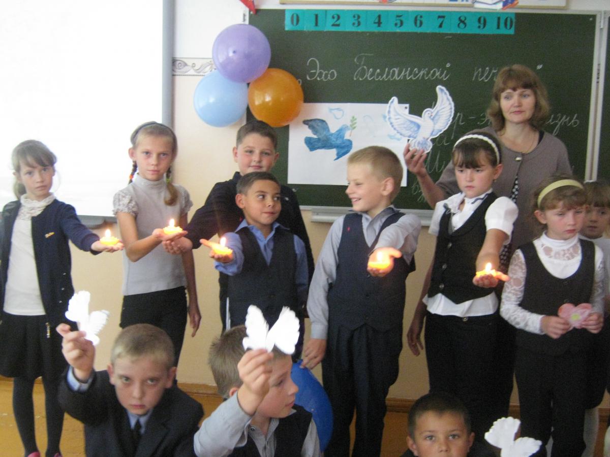 Маленьким жителям Беслана, их учителям, наставникам- всем кто погиб в тёмном пекле пылающего ада и кто выжил в эти страшные сентябрьские дни свои классные часы посвятили учащиеся филиала.
