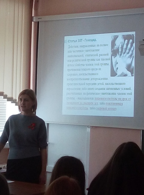 С целью сохранения исторической правды о преступлениях нацистов и их пособников в отношении мирных советских граждан в годы Великой Отечественной войны, 19 апреля в МБОУ СОШ с. Братовщина имени Героя Советского Союза В. С. Севрина учитель истории Е.И. Захарова провела в 9-11 классах классный час "День единых действий в память о геноциде Советского народа нацистами и их пособниками в годы Великой Отечественной войны".