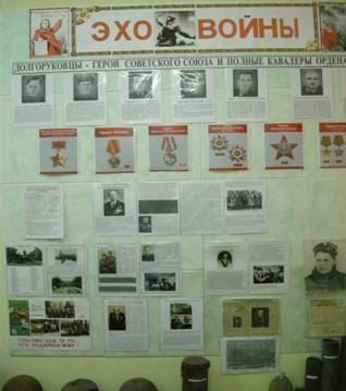 Центральное место в экспозиции "Эхо войны занимает информация о 5 Героях Советского Союза и 2 полных Кавалерах Ордена Славы- наших земляках.