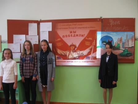 В 3-4 классах прошёл Урок  мужества "Великая война и великая победа". В ходе мероприятия учащиеся познакомились с этапами Второй мировой войны, пчтили память погибщих минутой молчания. Также  ученики посетили  творческую мастерскую, где изготовили поделки на тему "Мы голосуем за мир. Нет войне".  Подготовила и провела урок мужества Вострикова Н.Е.