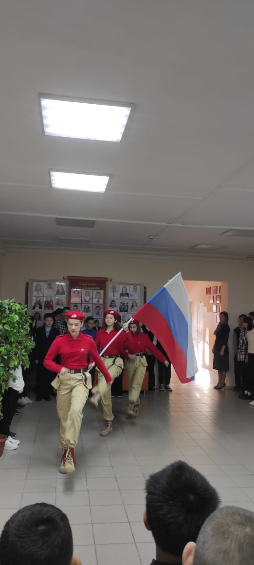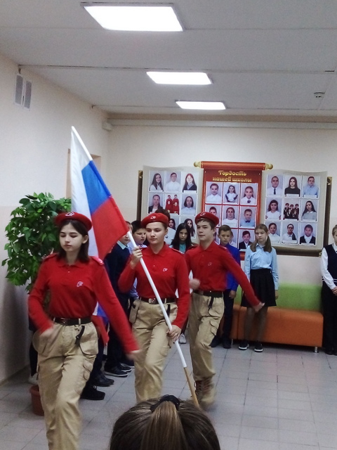 Новая учебная неделя в МБОУ СОШ с. Братовщина имени Героя Советского Союза В.С. Севрина стартовала с Церемонии выноса Государственного фага Российской Федерации и исполнения гимна.   Почётное право внести флаг РФ было поручено активным участникам военно – патриотического общественного движения «Юнармия» Чекановой Марии, Саввиной Яне и Андриянову Юрию.